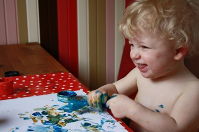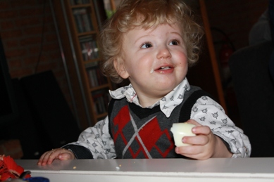 de koffie. Ties is gisteren weer bij het consultatiebureau geweest. En vanochtend is hij voor het eerst bij de kapper geweest. Hij vond het machtig interessant. En zat nog geen 2 tellen stil. Toch is het netjes geknipt zonder blessures. Zondag 4 april 2010 Eerste paasdag! Een drukke dag! Eerst netjes in de kleren. Dan eieren zoeken